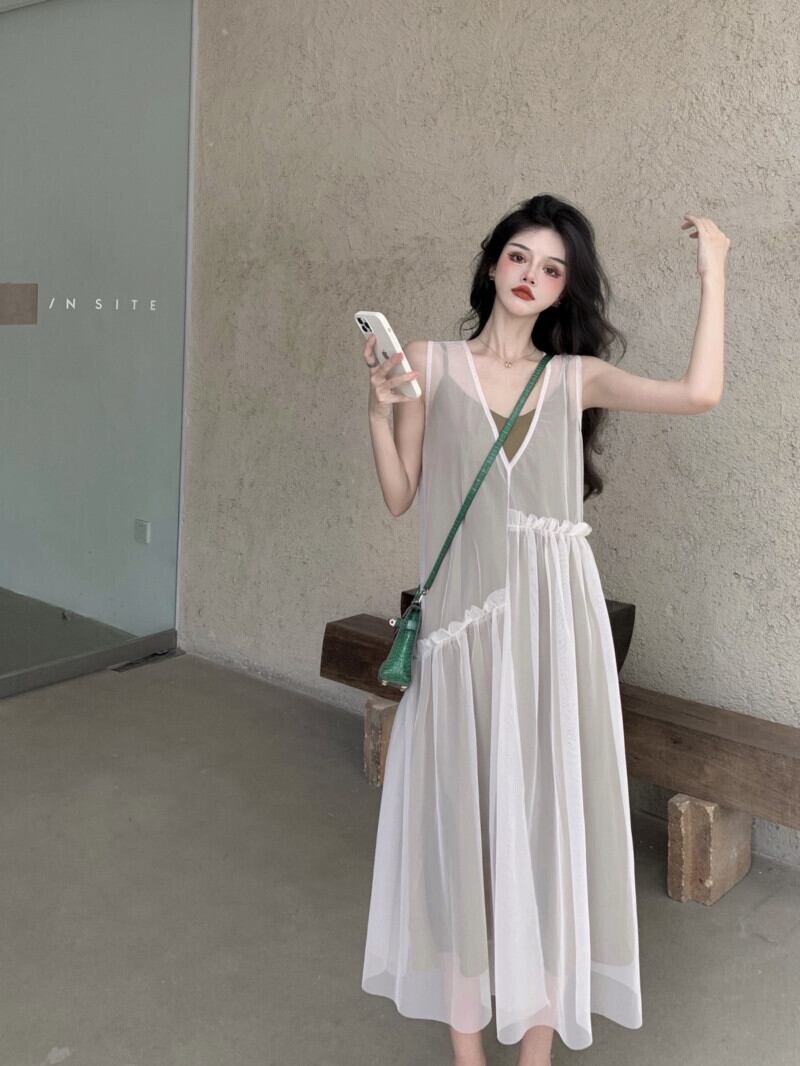 ホワイトVネックノースリーブドレス サマーロングスカート 夏物 タオタオイ72320387179