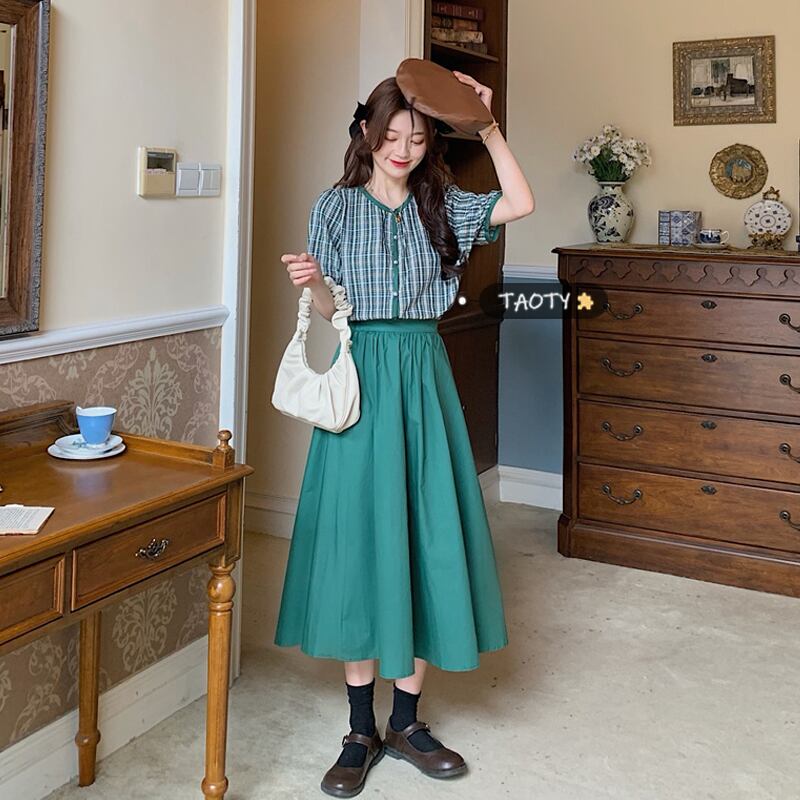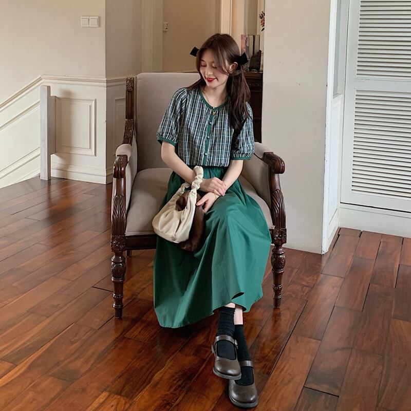 色:グリーンチェックトップ単品,ネイビーブルーのシャツ,緑のスカートワンピース,ネイビーブルーのワンピース