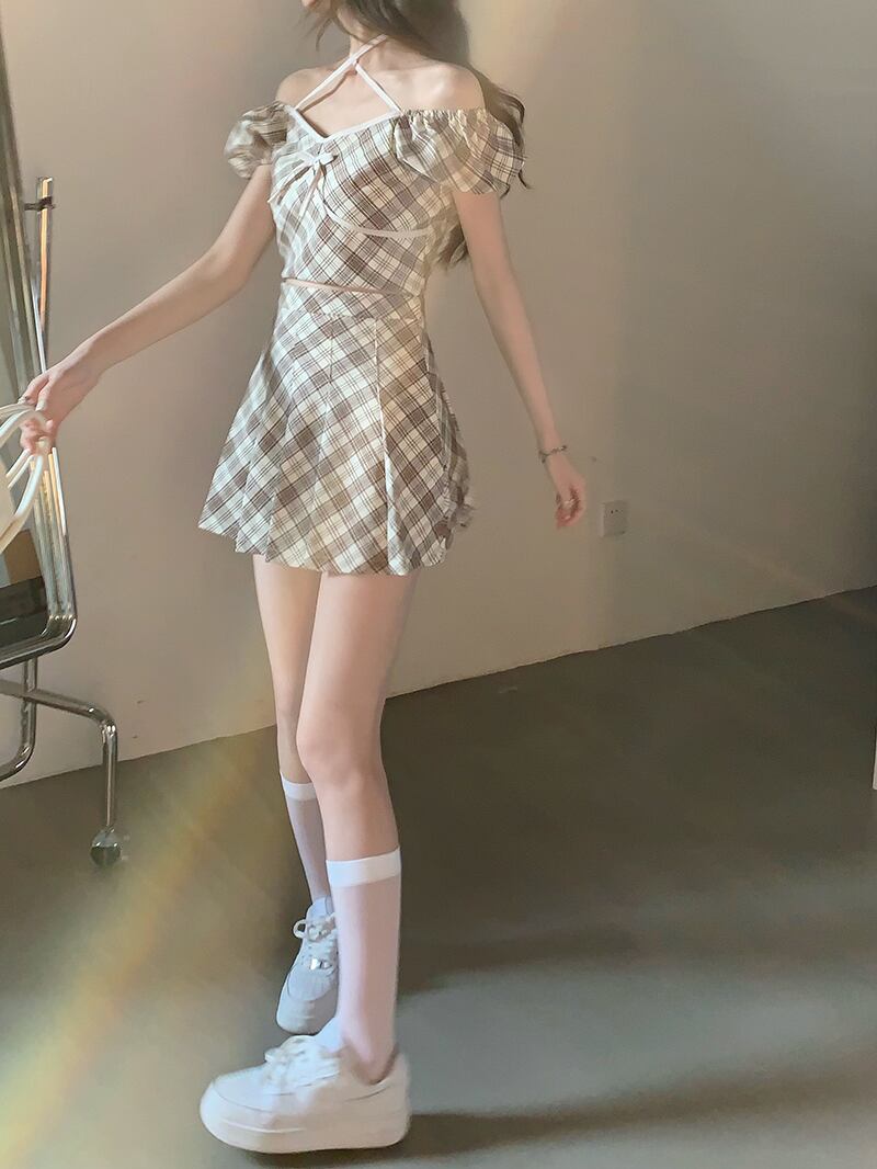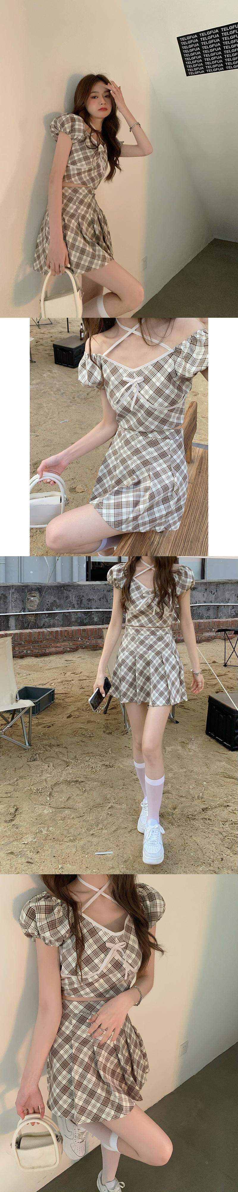 レディースサマーショート格子柄トップス ハイウェストウェストプリーツスカート 大人ガーリー スウィート キュート カジュアル 夏物 タオタオイ82498138776