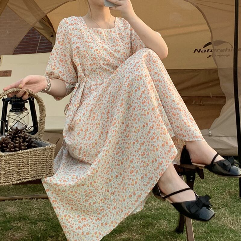 フローラルスリーブドレス サマースタンダードウェストロングスカート レトロ 夏物 花柄 スクウェア タオタオイ31633530928