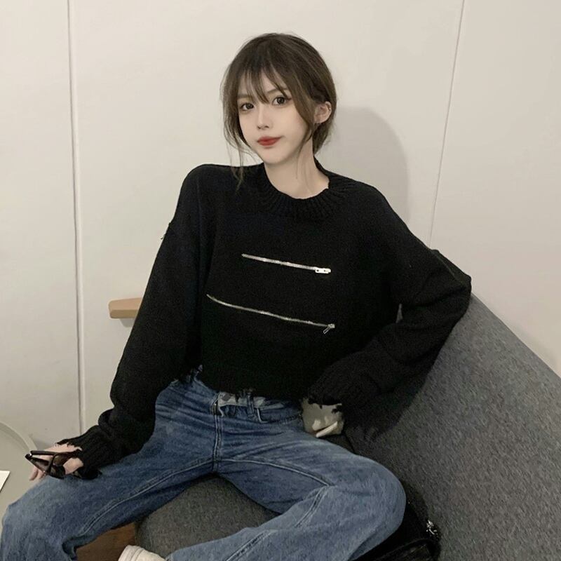 ブラックセーター スプリングオータムプルオーバー ショートトップス 春物 秋物 ステッチ タオタオイ94315658514
