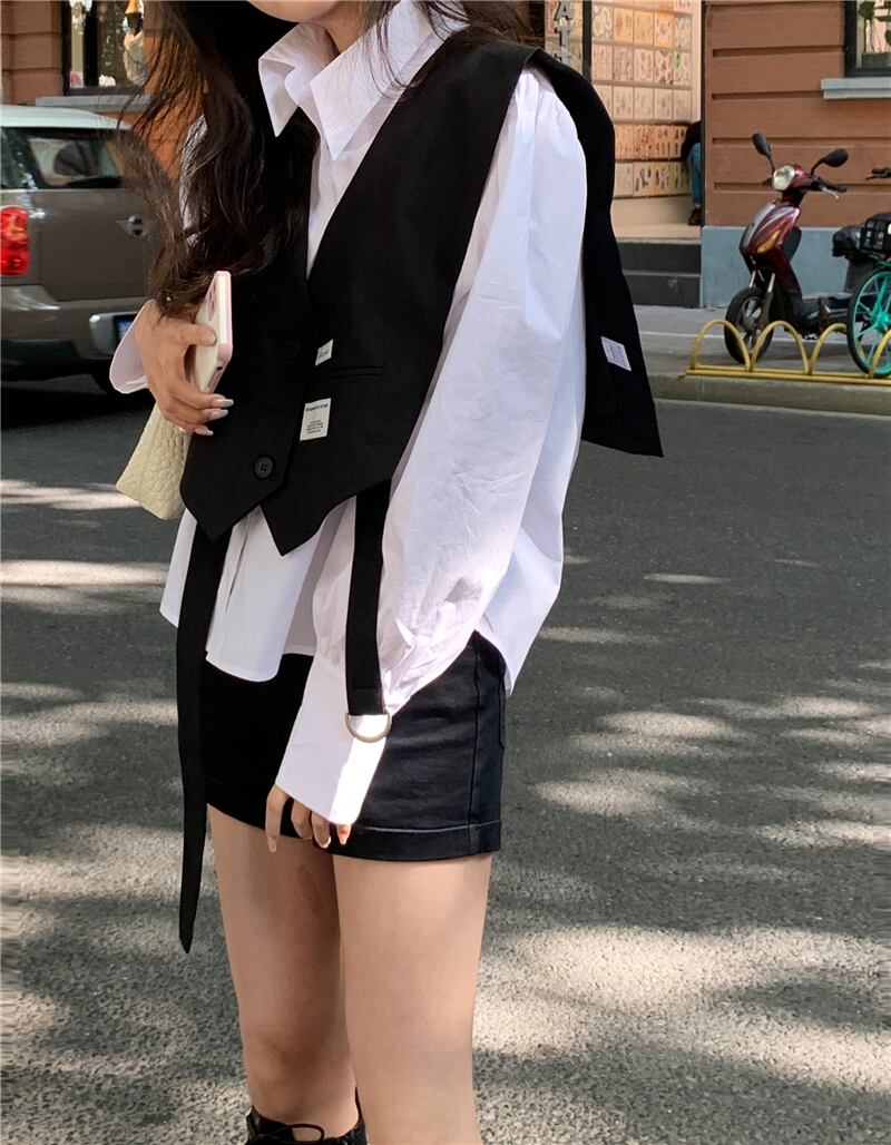色:白いシャツのワンピース,ブラックベストワンピース
