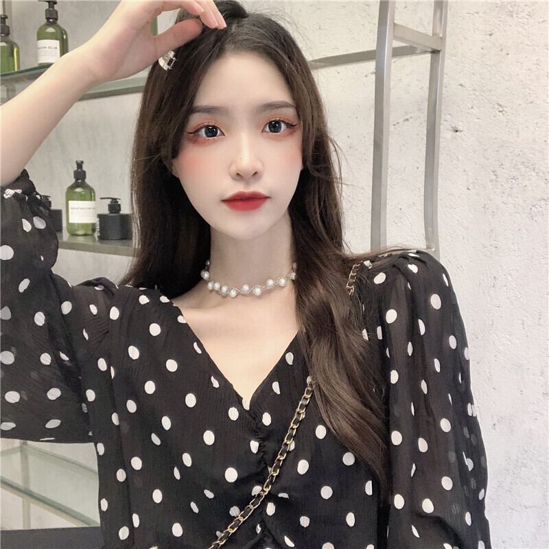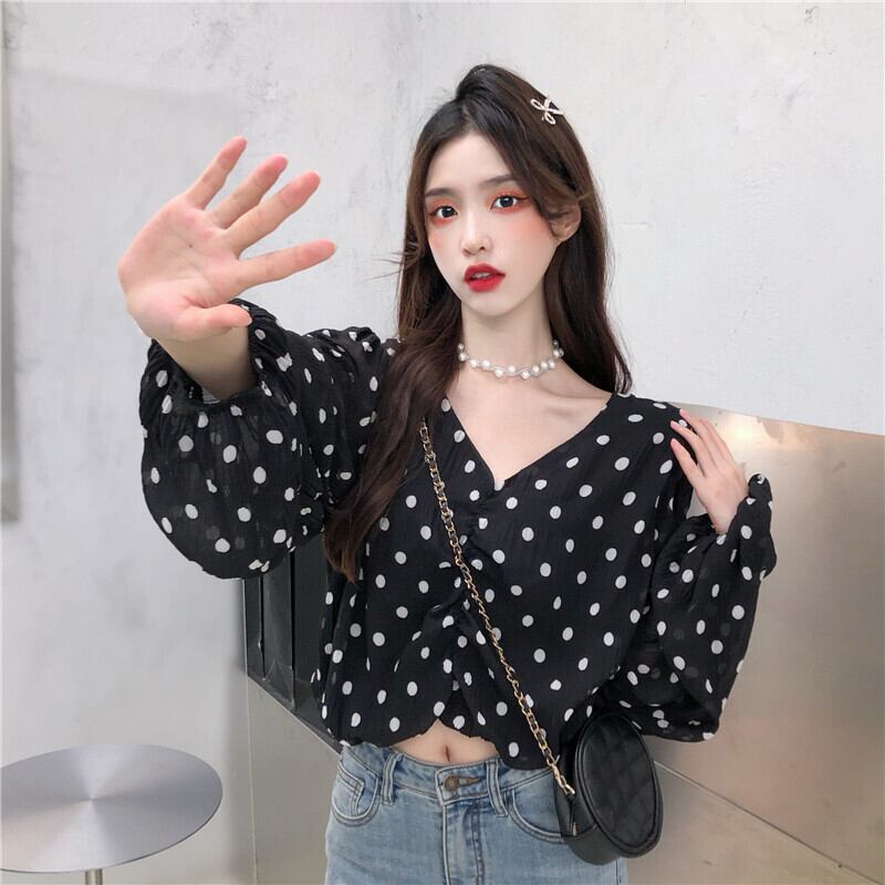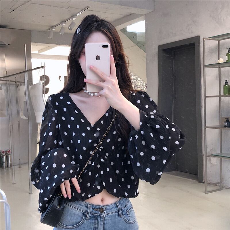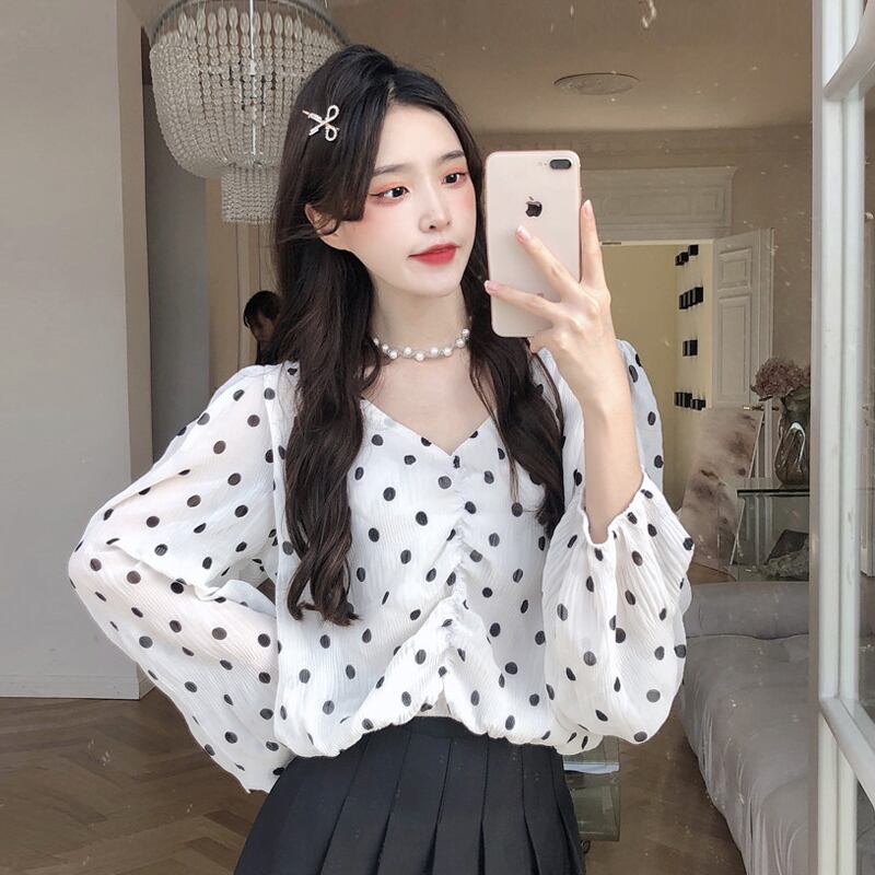 水玉Vネックシャツ スプリングオータムショートトップス ロング 春物 秋物 タオタオイ88299628198