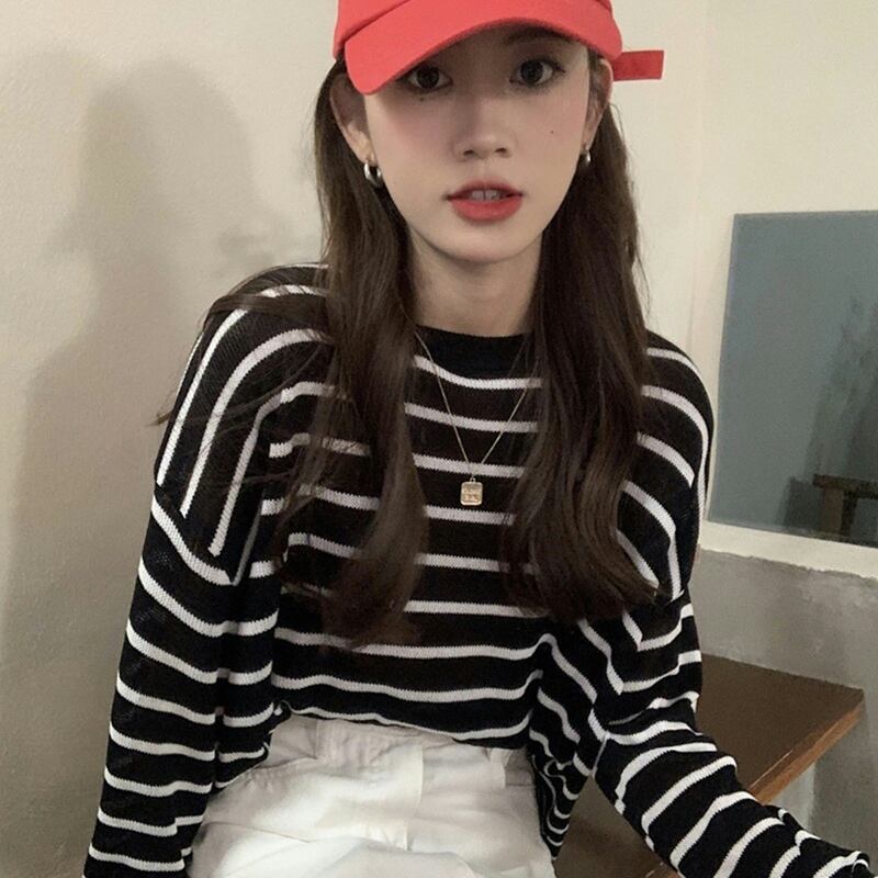 ストライプセーター スプリングオータムスタンダードルーズ薄手プルオーバー ロング レトロ 春物 秋物 タオタオイ68330632198