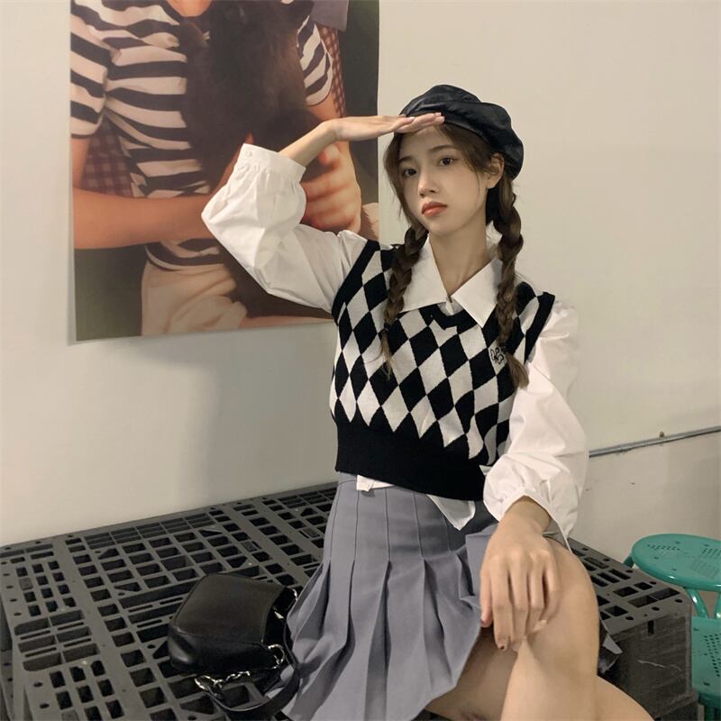 色:白いシャツのワンピース,ひし形のベスト,リンジカーディガンシングルピース