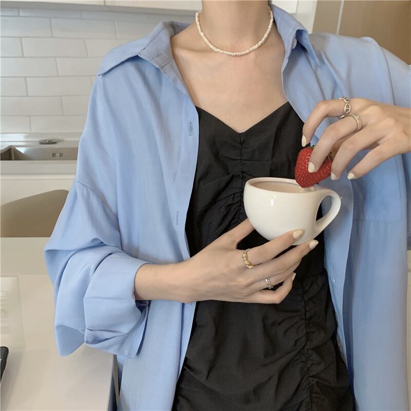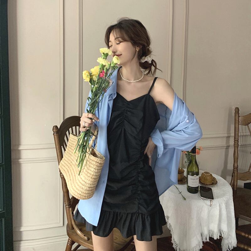 色:青いシャツワンピース,ブラックサスペンダードレスワンピース