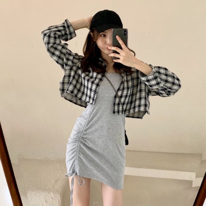 色:ブラックサスペンダードレスワンピース,グレーサスペンダースカートワンピース,格子縞のシャツワンピース