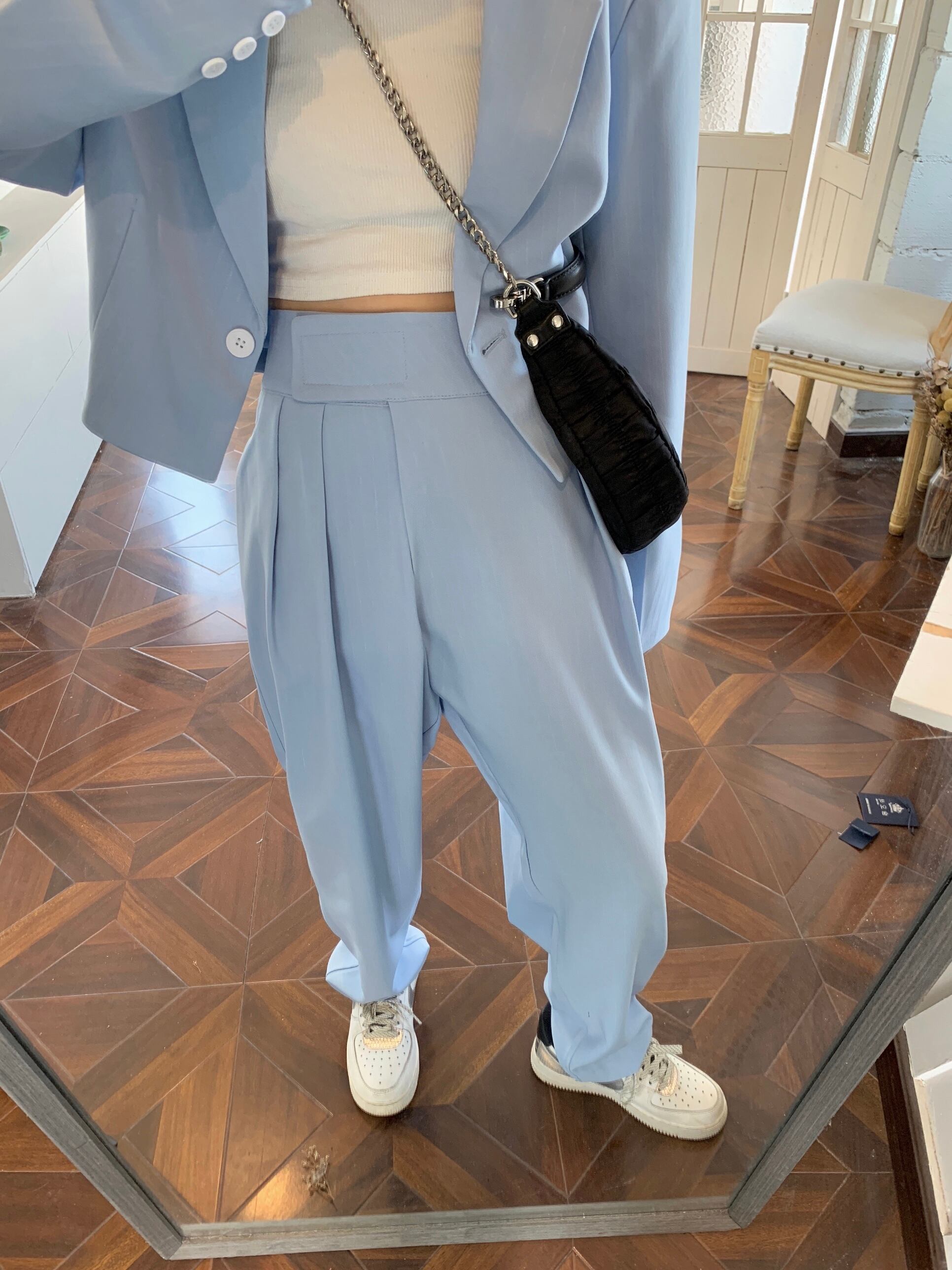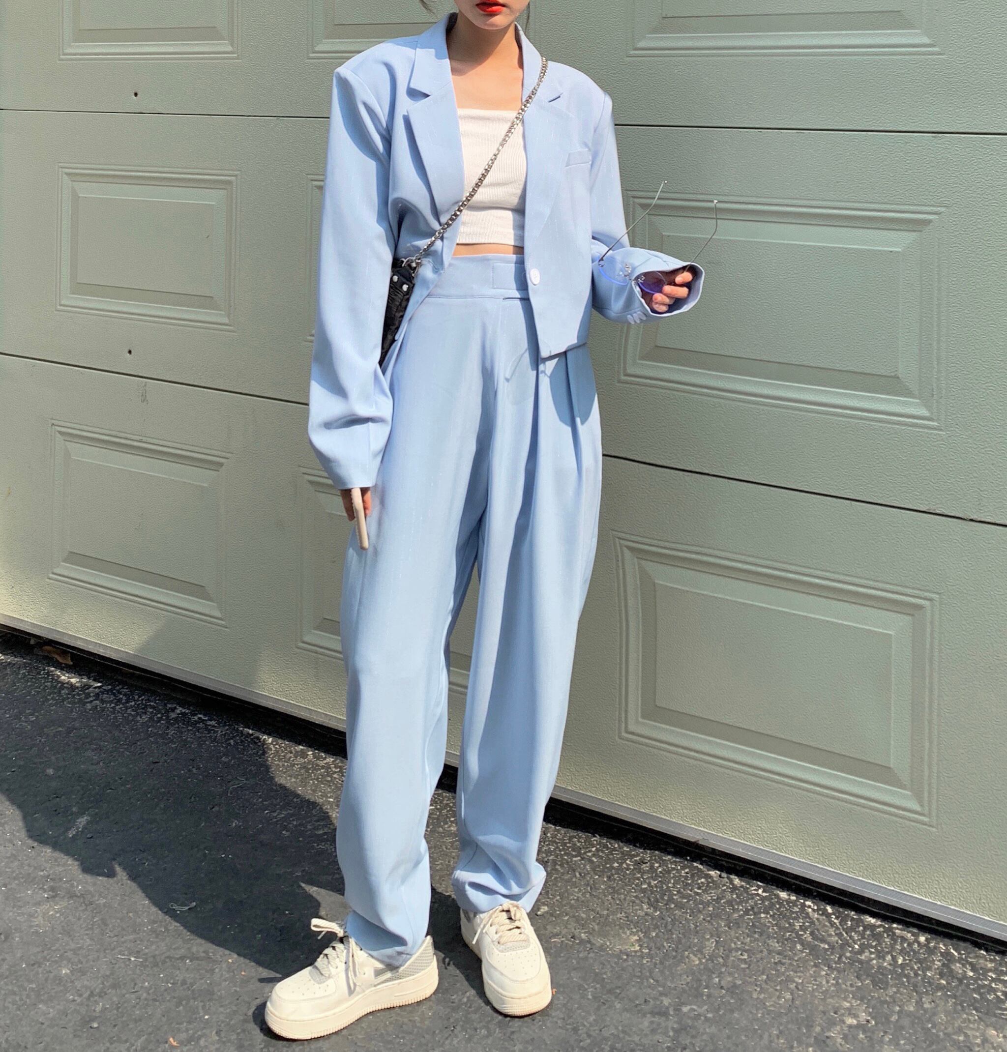 色:ブルースーツワンピース,青いパンツワンピース
